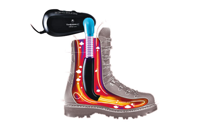 Der Thermic Refresher trocknet nasse Schuhe und Handschuhe in wenigen Stunden. UV-Licht reduziert Keime und Bakterien damit Geruch erst gar nicht entsteht. Trocknet nasse Schuhe und Handschuhe materialschonend, Trocknungszeit ist direkt am Gerät einstellbar (Timer: 1h, 3h oder 6h). Er ist Kompakt und leise und für alle Schuhtypen und Schuhgrößen geeignet. Die Thermic Refresher Antibacterial Dryer kommen nach Ihren sportlichen Aktivitäten zum Einsatz. Die Thermic Schuhtrockner verhindern die Entwicklung von Bakterien und Keimen und garantieren gleichzeitig eine optimale Temperatur in Ihren Schuhen. In wenigen Stunden sind Ihre Ski- und Sportschuhe wieder trocken, vorgewärmt und einsatzbereit. Dank der UV-Technologie des Thermic Refresher verhindert die Vervielfältigung der für störende Gerüche verantwortlichen Bakterien. Ihre Schuhe und Handschuhe sind somit am Morgen wieder natürlich frisch. Technische Details Thermic Refresher Schuhtrockner trocknet feuchte Schuhe, Handschuhe in nur wenigen Stunden Die aus den Düsen ausströmende Luft im Schuh erreicht eine Temperatur von ca. + 20°C über Raumtemperatur. UV-Strahlen verhindern die Entwicklung von Bakterien und Keimen Absorbiert und beseitigt unangenehme Gerüche Einstellung der Trockenzeit am Gerät (Timer: 1h, 3h oder 6h) Sehr kompakt, leise und einfach zu verstauen Für alle Schuhtypen wie Skischuhe, Wanderschuhe oder Arbeitsschuhe und Schuhgrössen geeignet Die länge der Schuhtrockner Rohre sind einstellbar Der Timer des Refresher kann über die Funktionstaste aktiviert werden. Durch jeweiliges Drücken der Funktionstaste wird die Timer-Zeit eingestellt (1 Stunde, 3 Stunden oder 6 Stunden). Die ausgewählte Timer-Zeit wird durch das Leuchten der jeweiligen LED angezeigt. Wiederholtes Drücken der Funktionstaste ändert die Timer-Zeit: EIN/ Dauberbetrieb > 1h > 3h > 6h > AUS > EIN/Dauerbetrieb > 1h usw. Wenn keine der drei Timer Zeitanzeigen leuchtet ist der Therm-ic Refresher im Dauerbetriebsmodus.